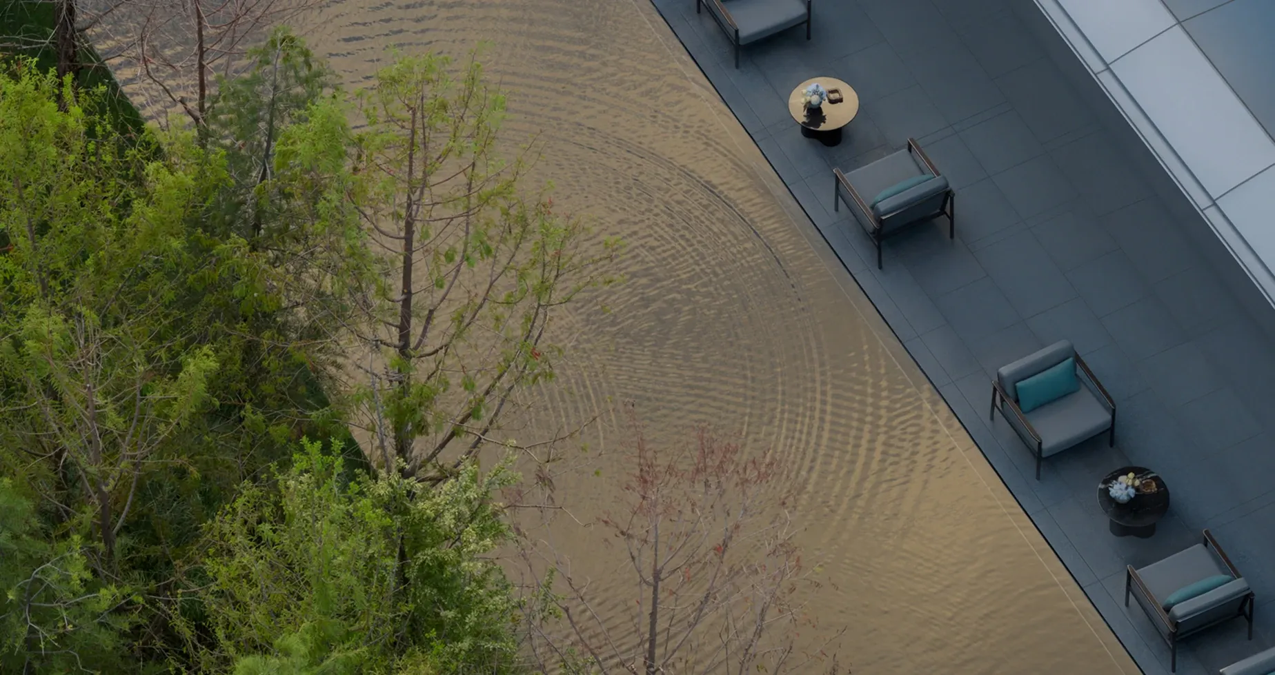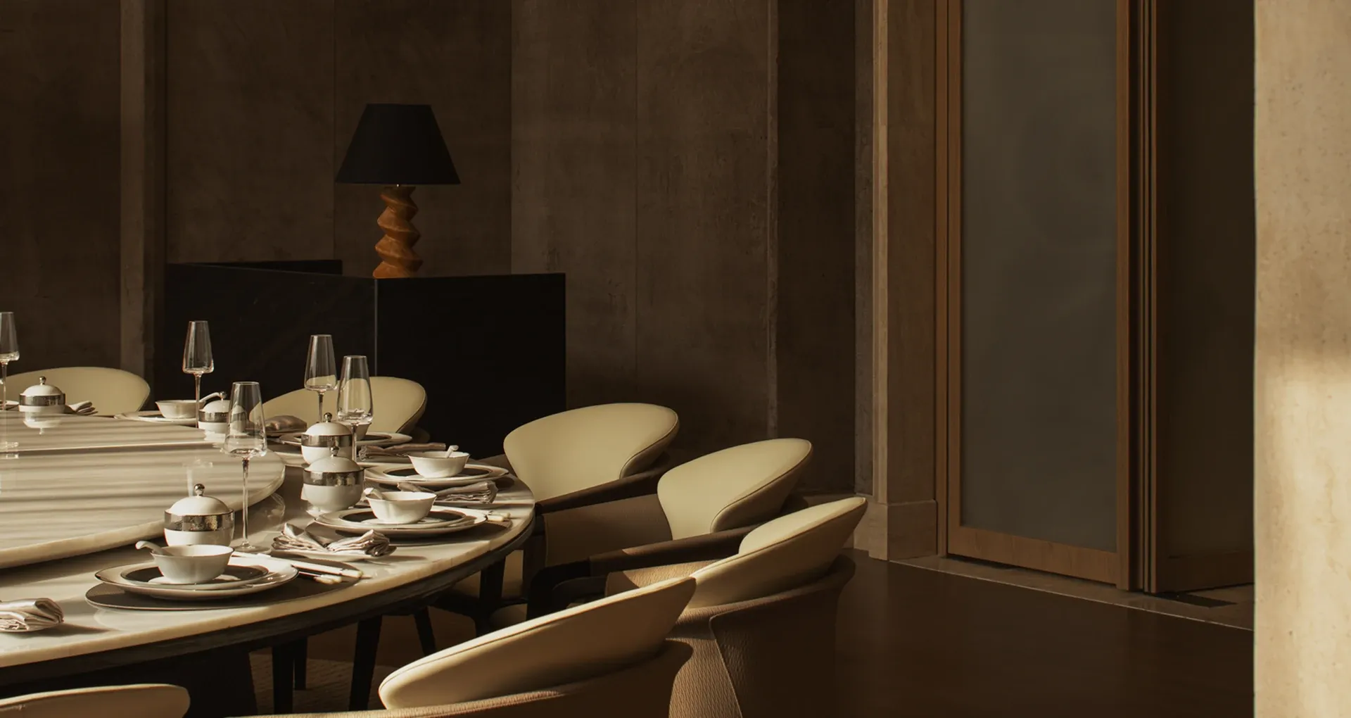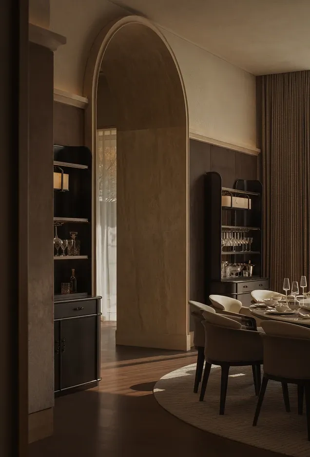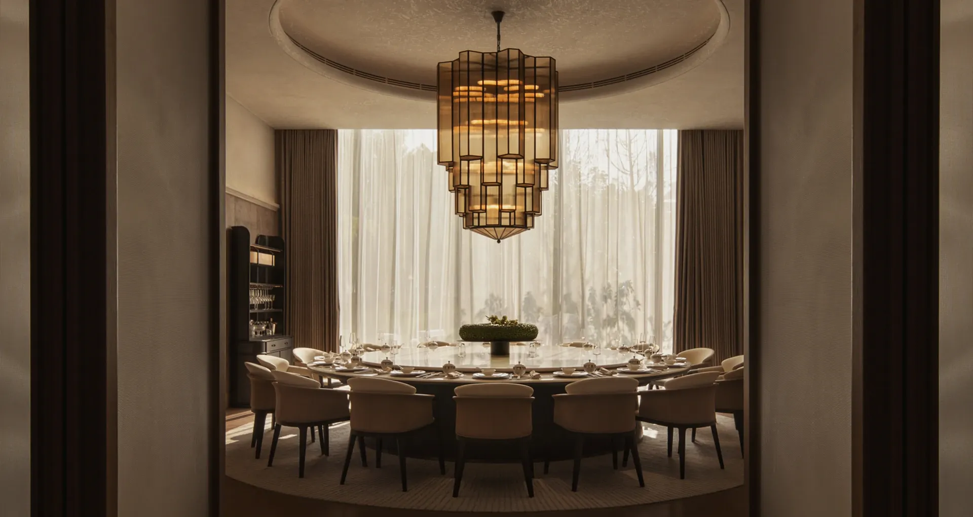 The sofas and round tables enclose a space of refined spirit. The private dining area unfolds in a circular layout, with layered metal pendant lights drawing the focus of light and shadow. Pale curtains fall softly in the daylight, enhancing the tranquility of the dark wood tones.
