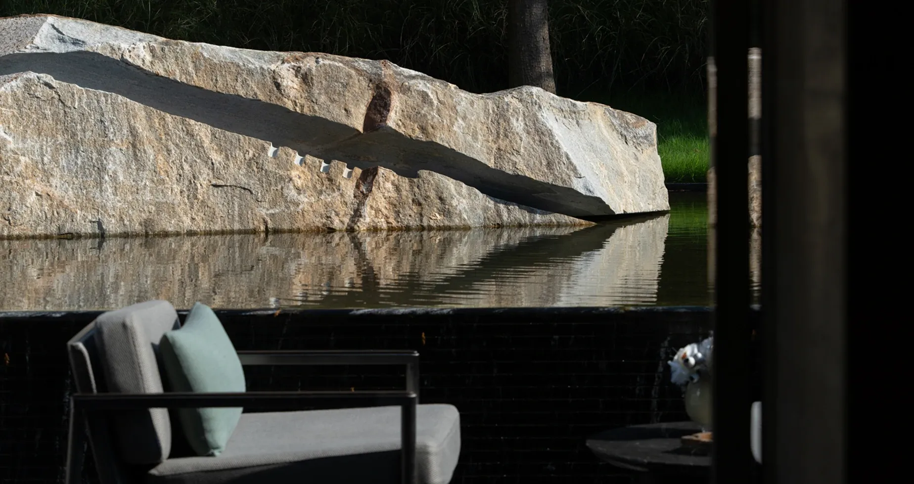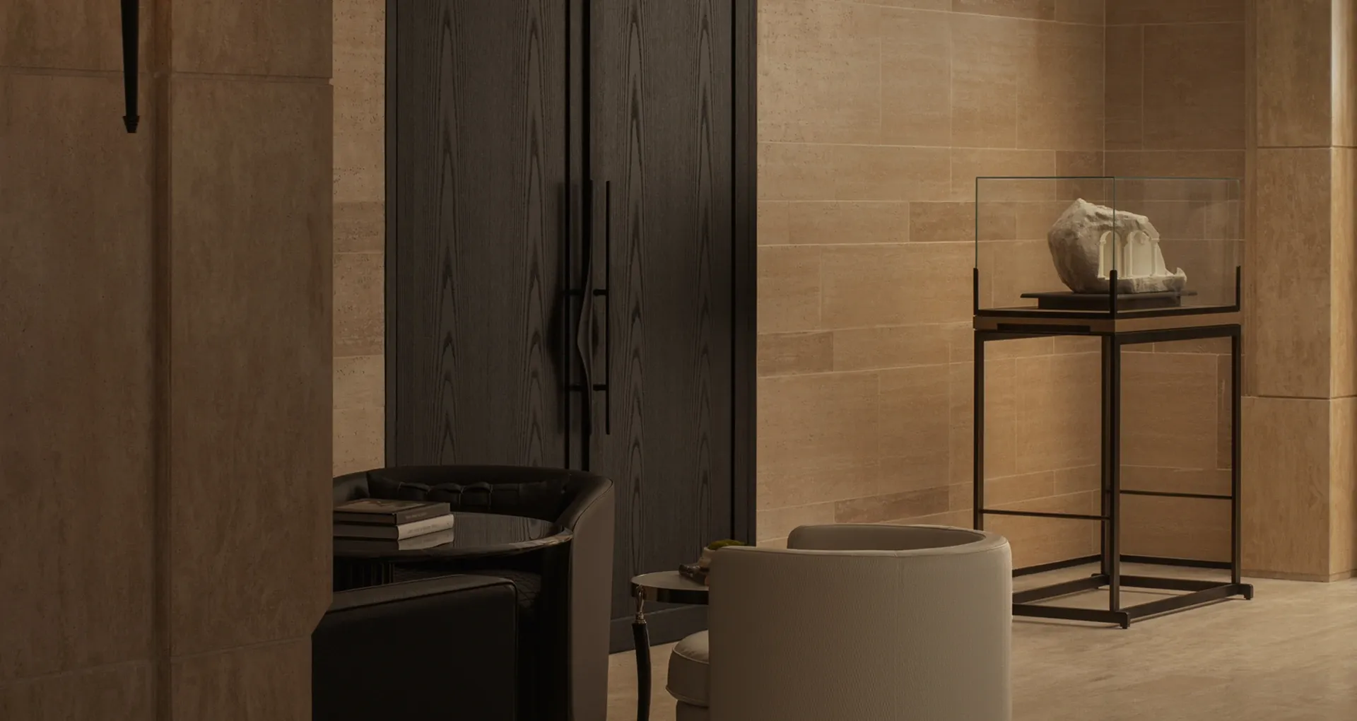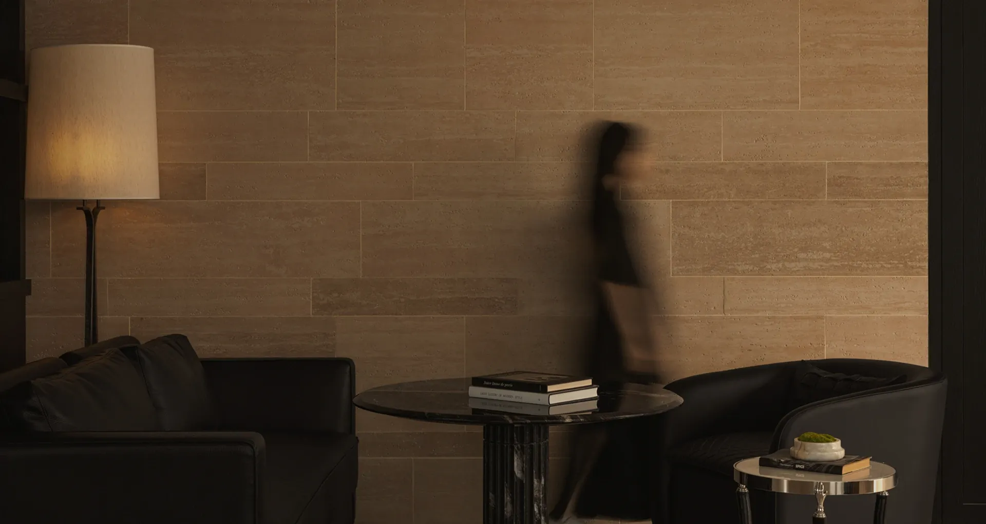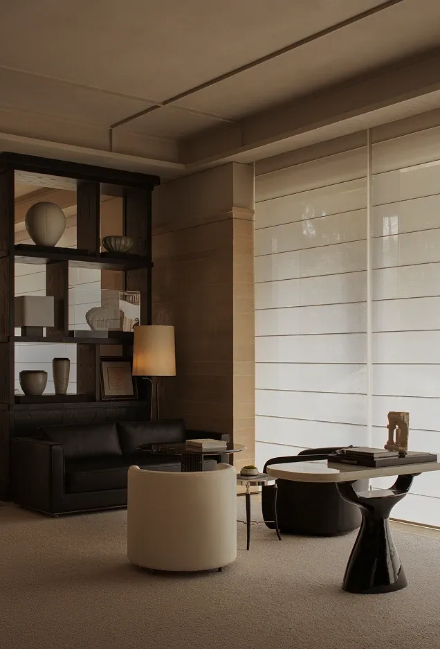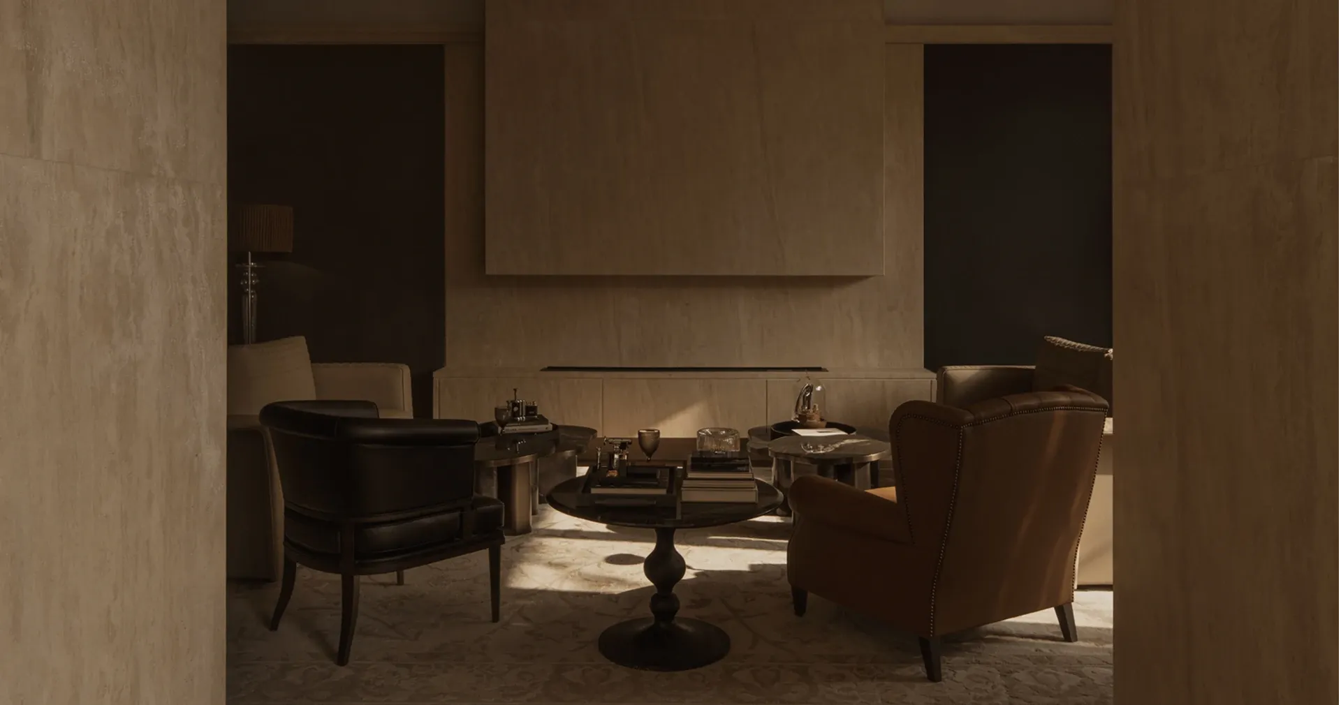 Layers of leather and fabric interweave in shades of black and brown, crafting an elegant setting for gathering. The carpet's texture shifts with the play of light and shadow, evoking an ambiance steeped in a discernible air of old-money elegance.