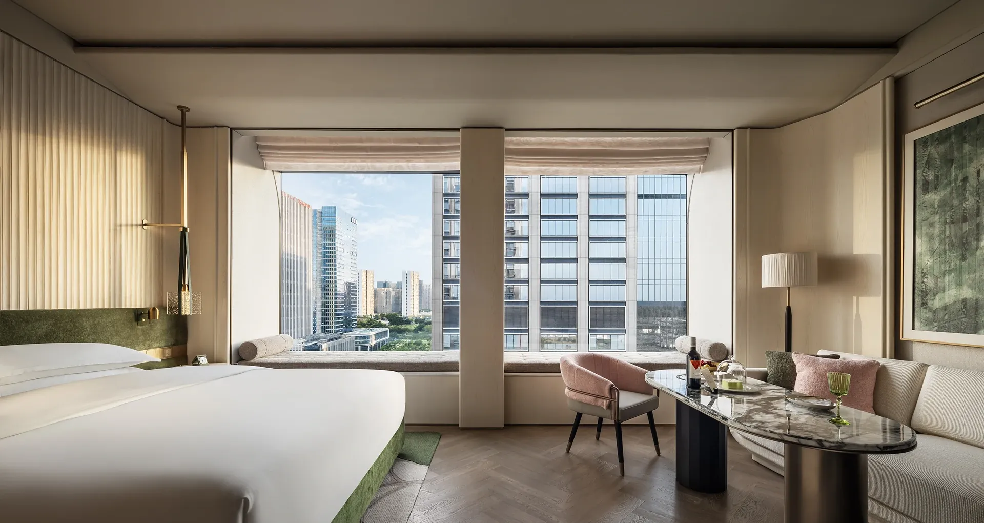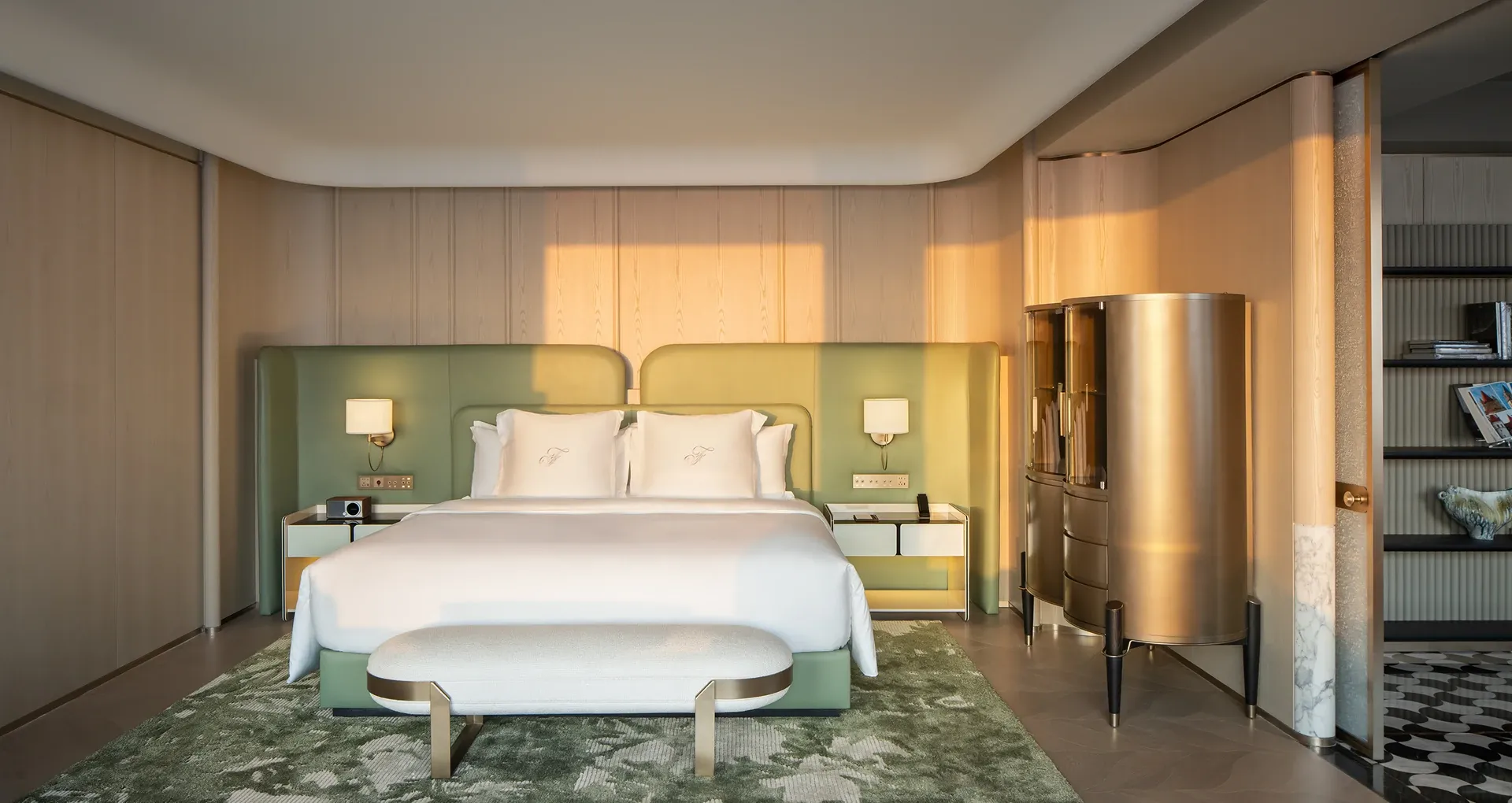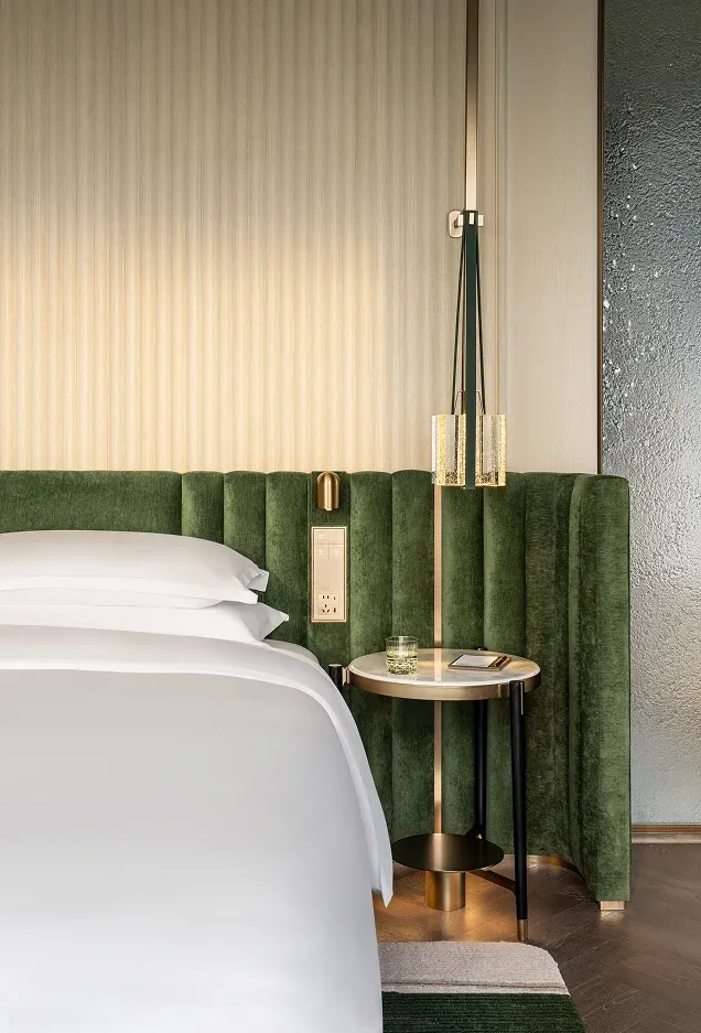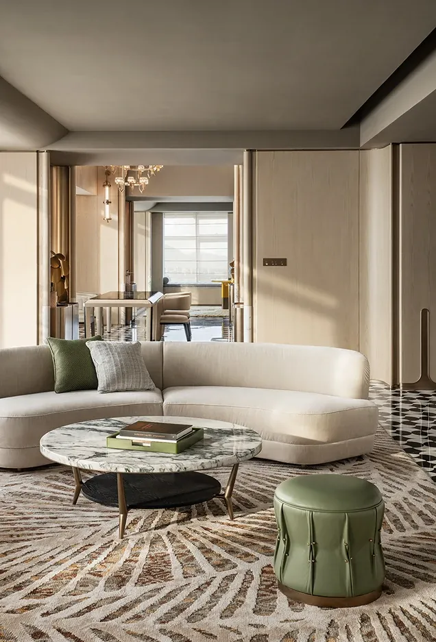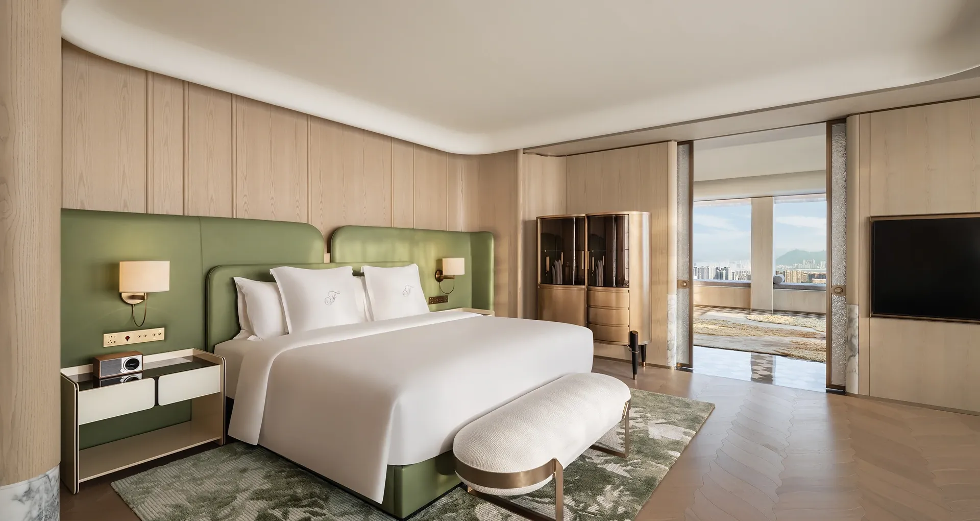 The guest room design merges the ultimate experience of 'living above the clouds' with the profound sense of belonging inherent to a residence. Meticulously crafted details are evident throughout, complemented by custom furnishings. These elements, blended with rich textural finishes and artistic wall treatments, create an ethereal sense of layered sophistication and a deeply comforting atmosphere of refined elegance.