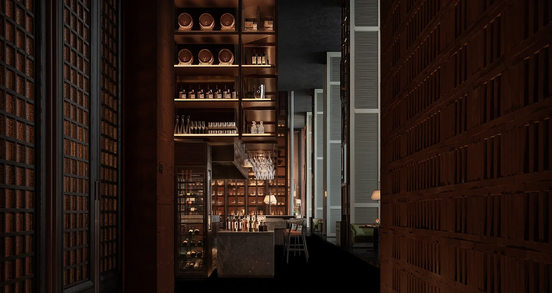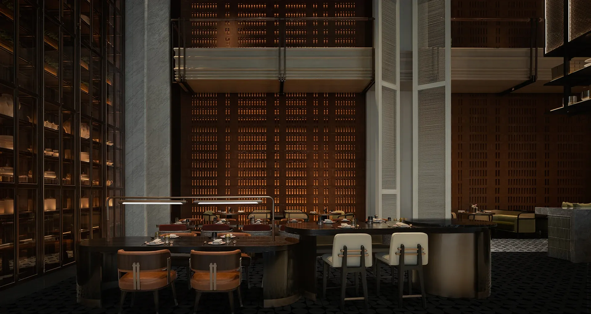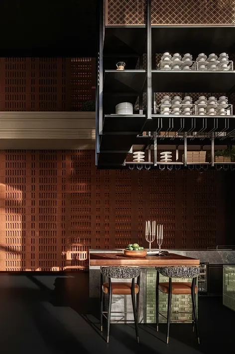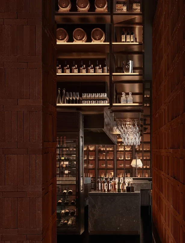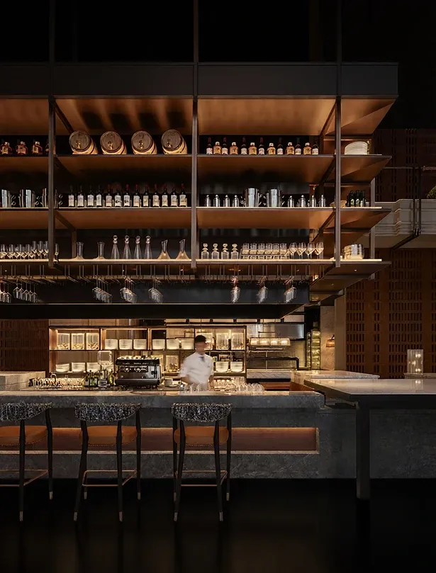 Artistic iron frames, transparent green plant displays, and an open show kitchen come together to create a vibrant and sensorially rich scene. In the bar area, a curated selection of fine wines sits elegantly within the wine cabinet, echoing the dancing flames and aromatic air of the open kitchen — awakening the most primal appetites and emotions.