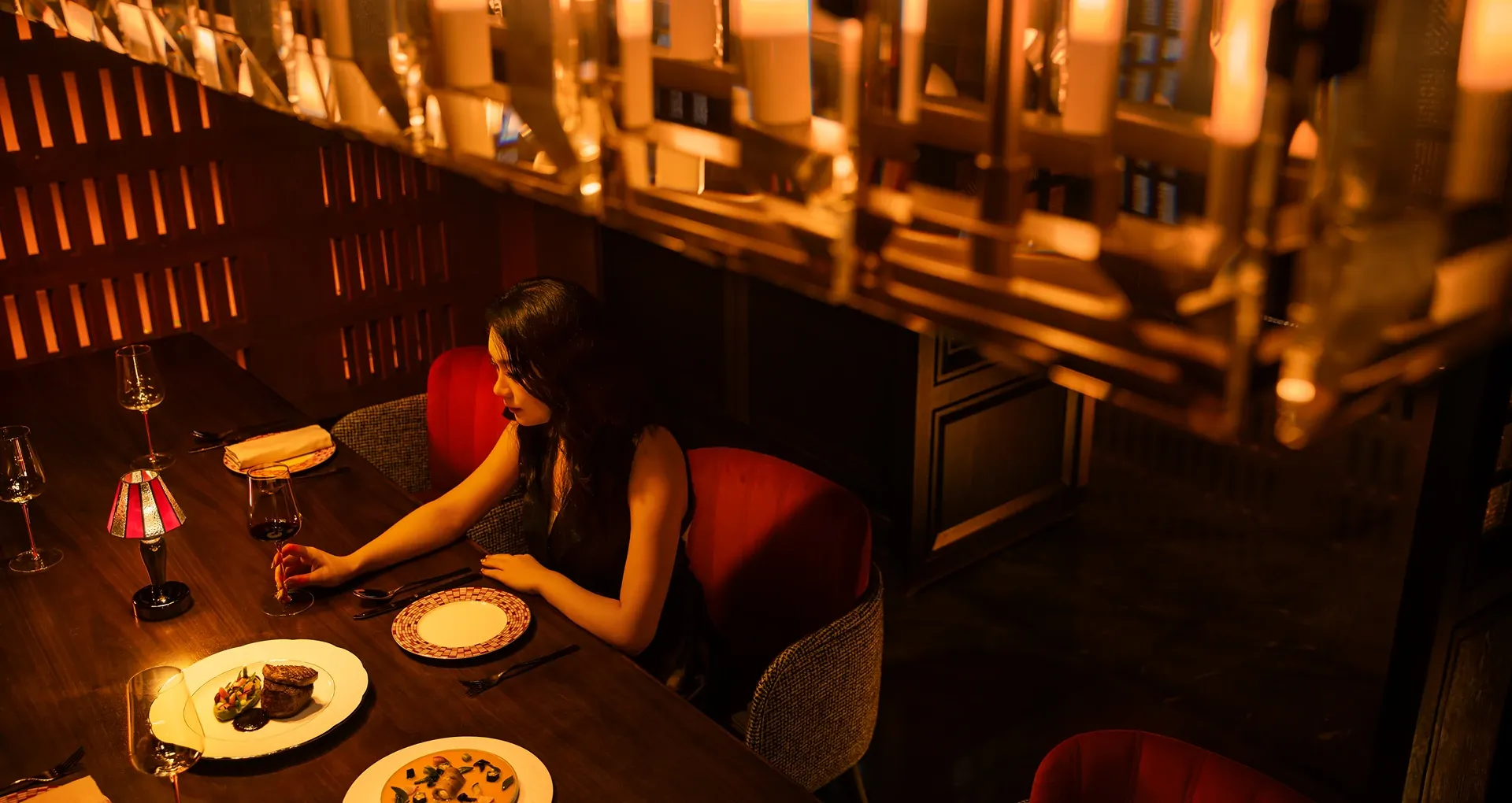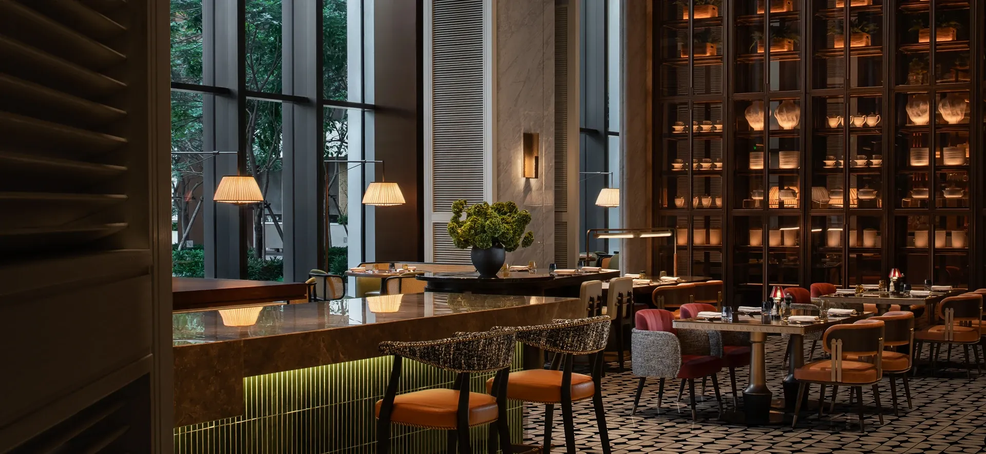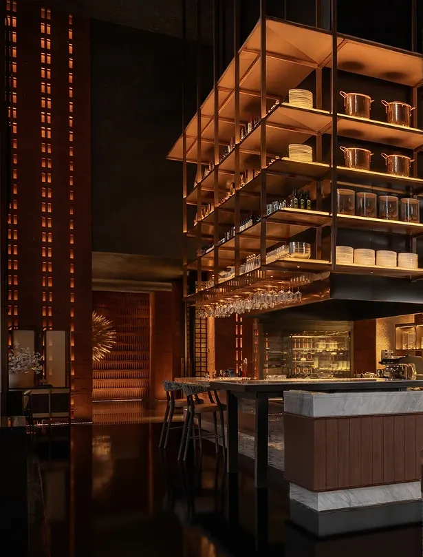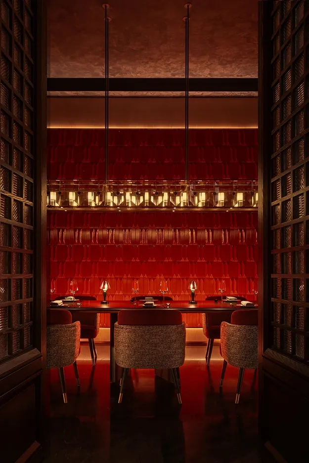 Artistic iron frames, transparent green plant displays, and an open show kitchen come together to create a vibrant and sensorially rich scene. In the bar area, a curated selection of fine wines sits elegantly within the wine cabinet, echoing the dancing flames and aromatic air of the open kitchen — awakening the most primal appetites and emotions.