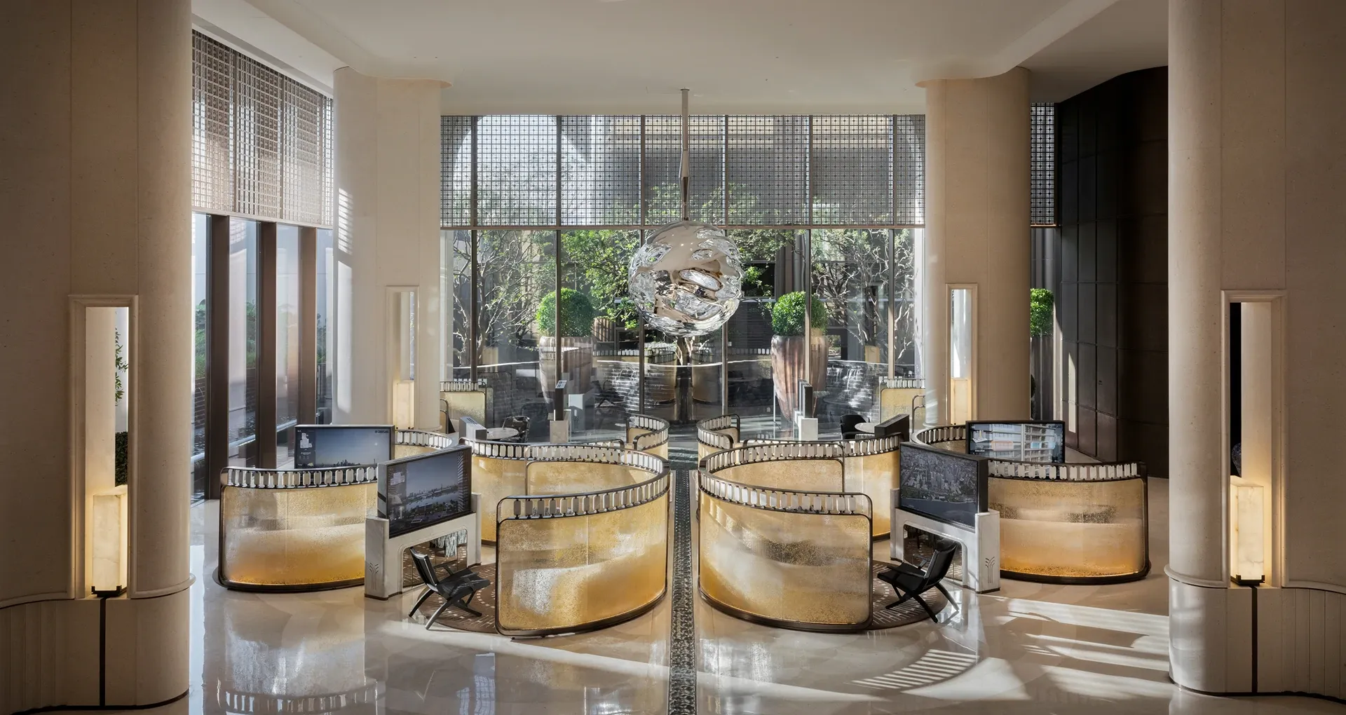 In the negotiation area, curved screens enclose a quiet sanctuary; set against a tone of soft white, structural lines flow like the waters of the Pearl River, converging at the central art sphere. This sphere acts as a "bright pearl," refracting light to harmonize with the traditional Lingnan window grids.