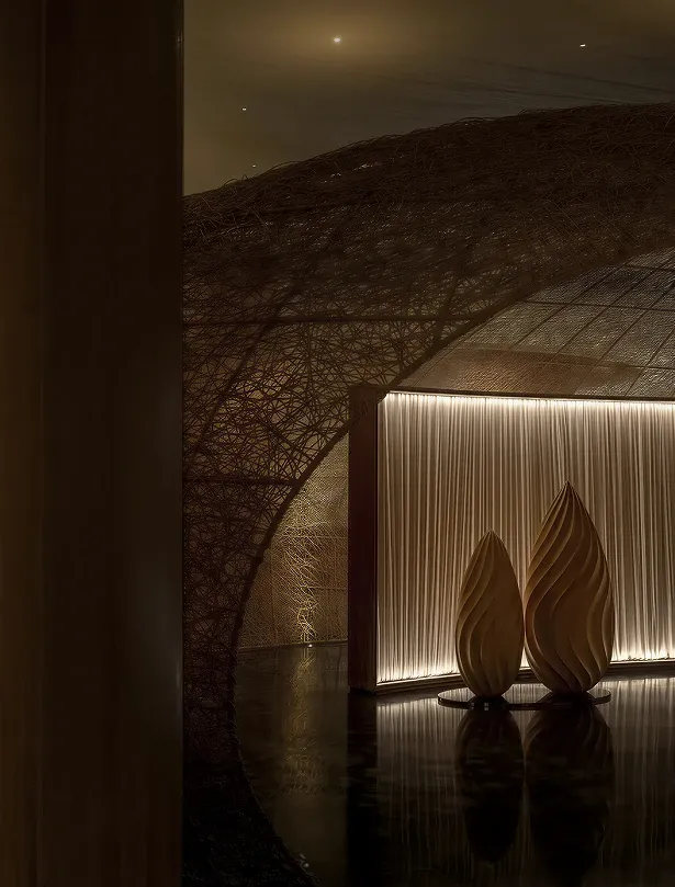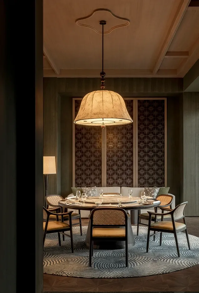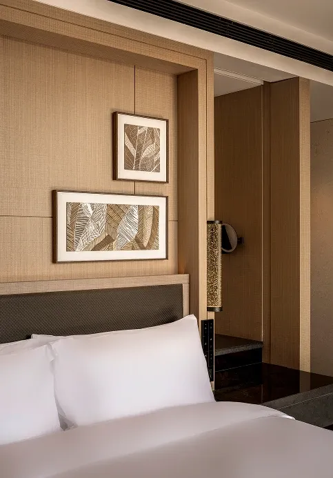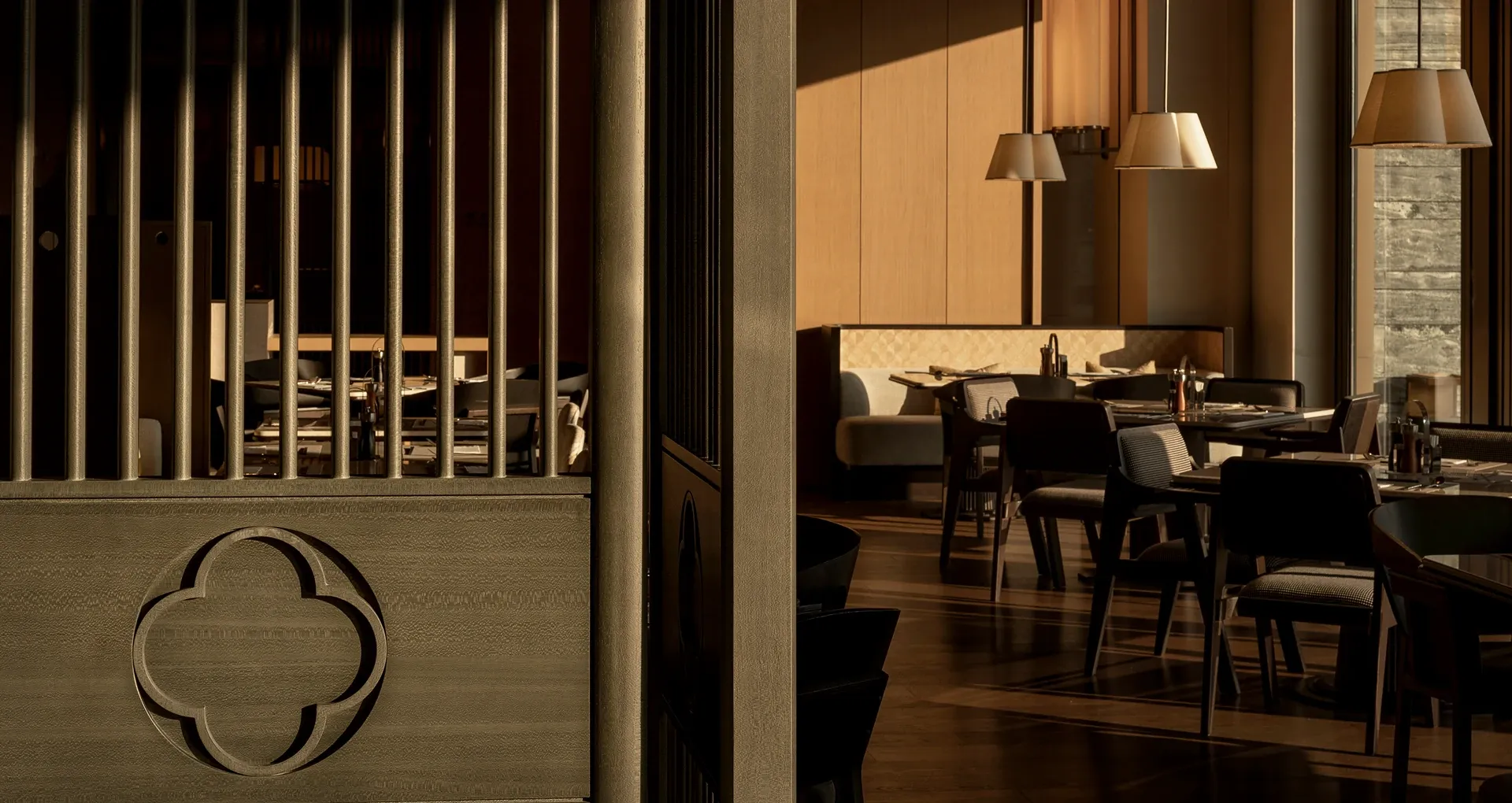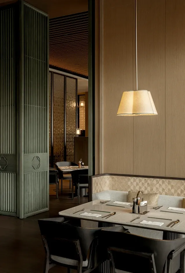 The hotel's design seamlessly intertwines natural elements with Eastern aesthetics. Inspired by the "Autumn Harvest" of Tianmu Mountain, the all-day dining restaurant transforms local elements like ginkgo leaves and hickory nuts into exquisite screen embroideries and tableware motifs, crafting a culinary sanctuary that celebrates harvest and sharing.