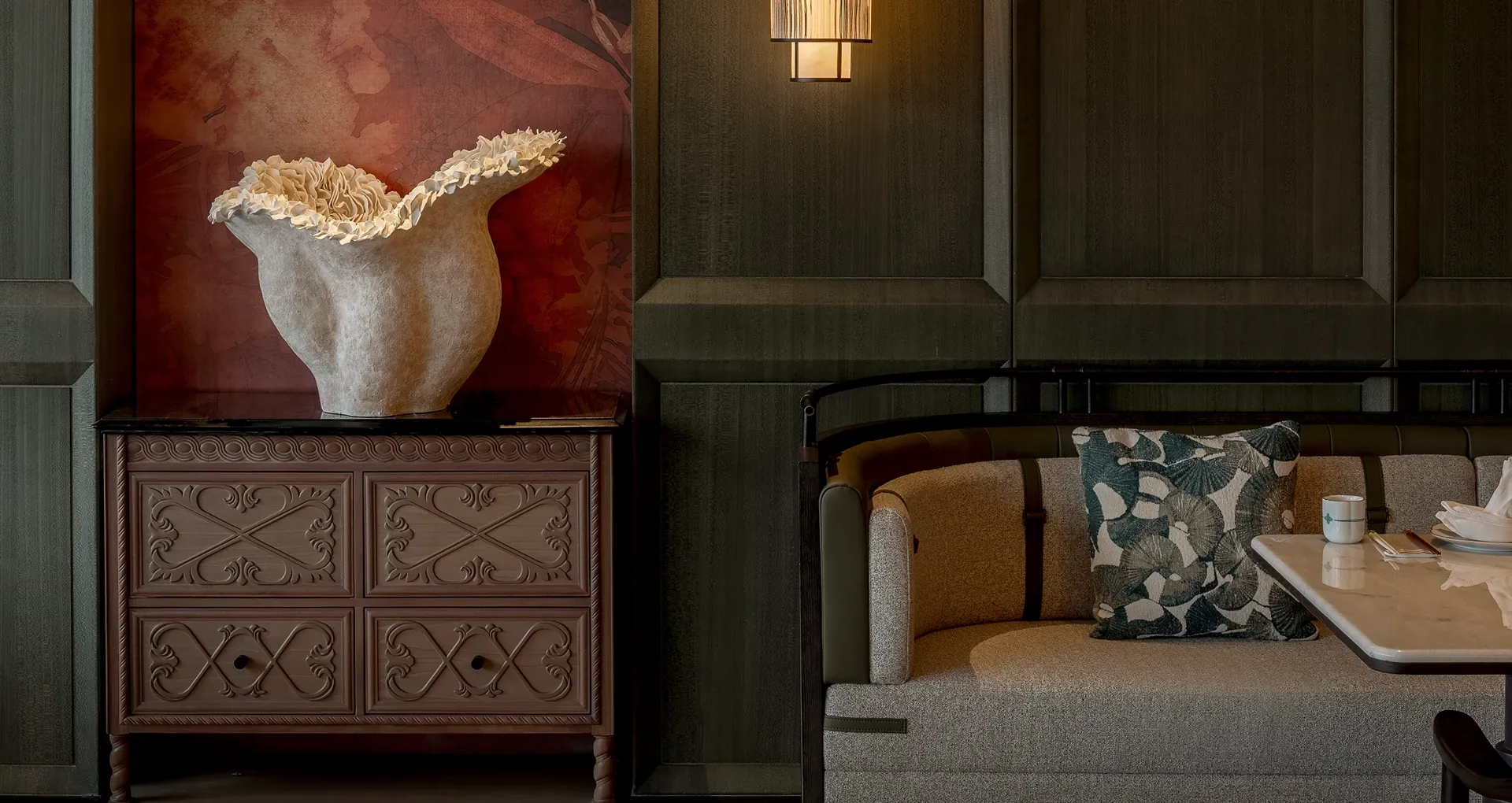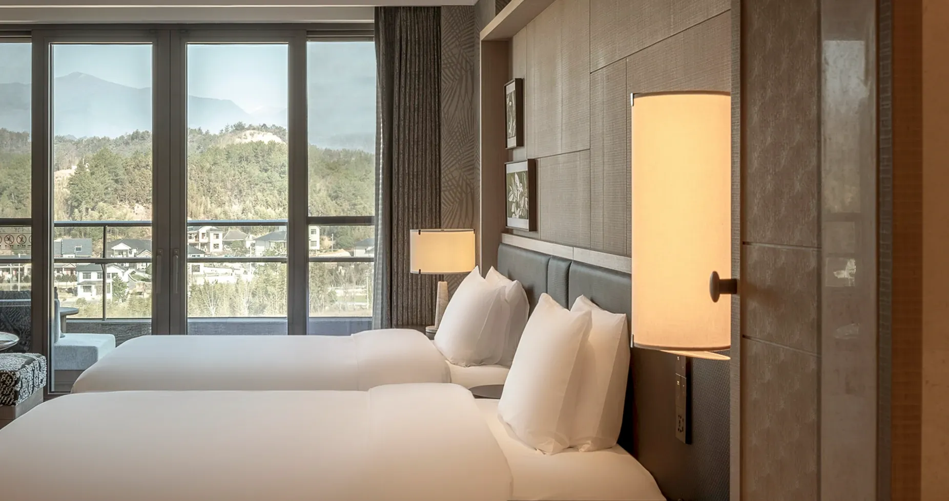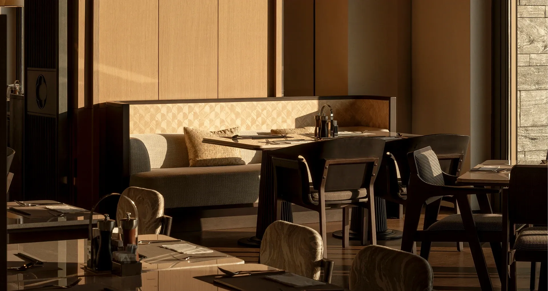 The hotel's design seamlessly intertwines natural elements with Eastern aesthetics. Inspired by the "Autumn Harvest" of Tianmu Mountain, the all-day dining restaurant transforms local elements like ginkgo leaves and hickory nuts into exquisite screen embroideries and tableware motifs, crafting a culinary sanctuary that celebrates harvest and sharing.