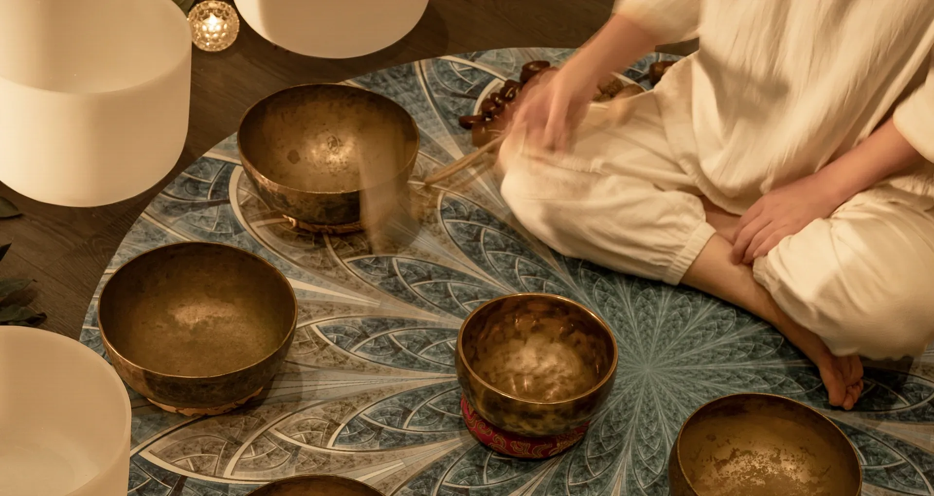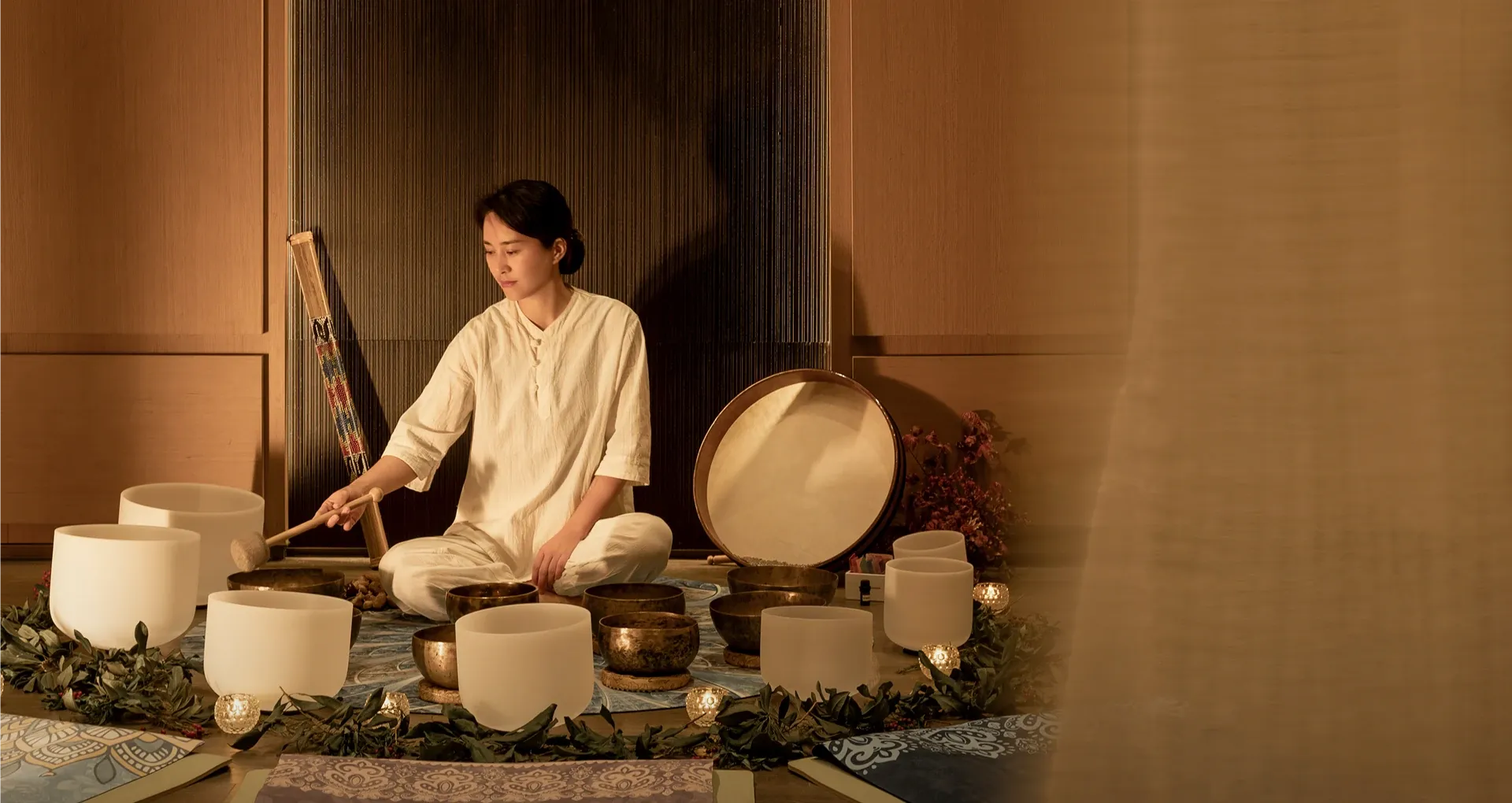 The meditation area unfolds as a realm of ethereal tranquility. Moonlit wall sconces and sheer white curtains filter out the worldly clamor, allowing breath and soul to deeply settle amidst woody aromas and the lingering resonance of singing bowls.