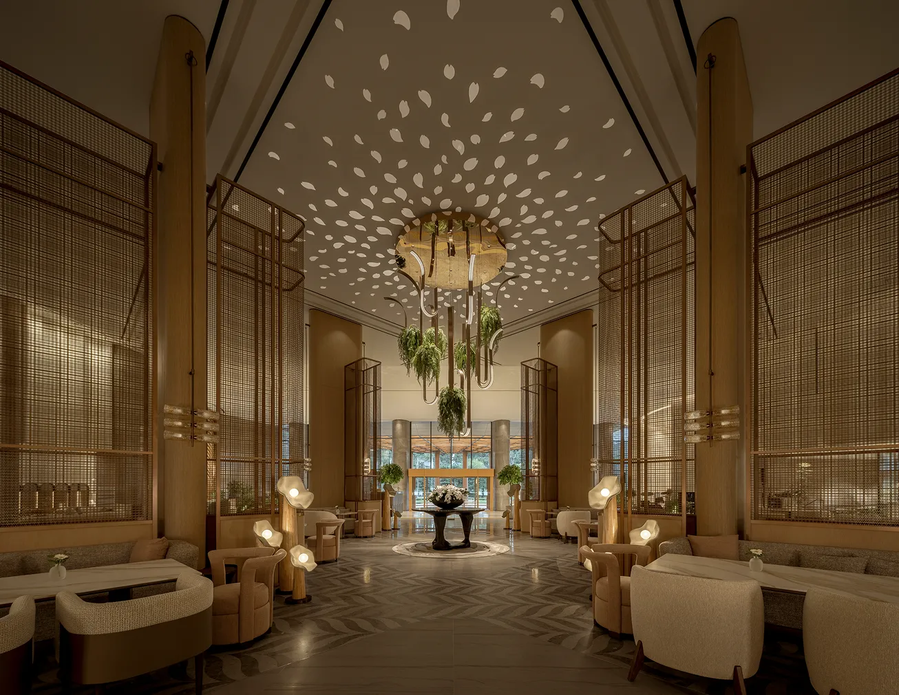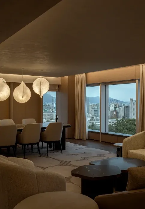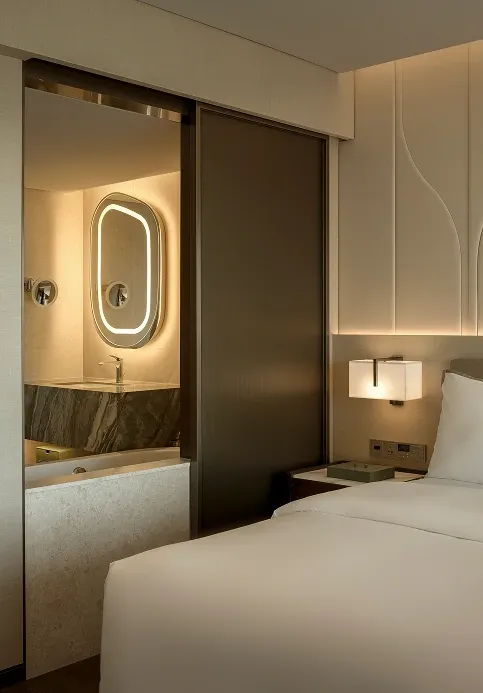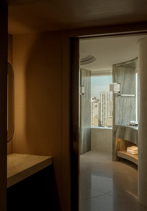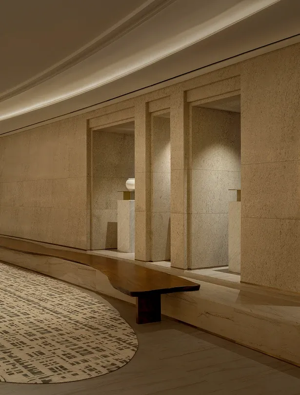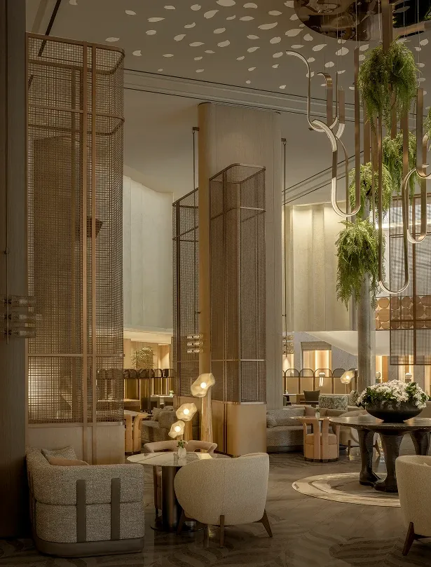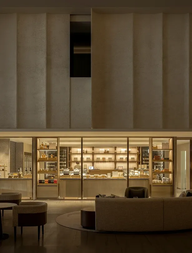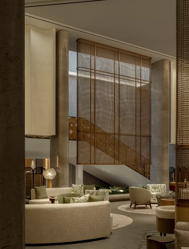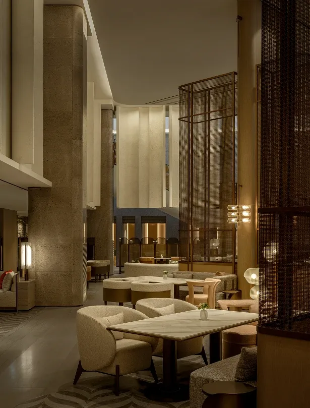 Stepping into the all-day dining restaurant feels like entering a breathing urban oasis, where warm timber and raw stone intersect to capture nature's purest textures. Cultural nuances emerge through modern geometric deconstructions of traditional Korean Bojagi fabrics, elegantly rendered in stone and wired glass. As sunlight filters through the layered latticework, every dining moment is bathed in a warm, healing glow.