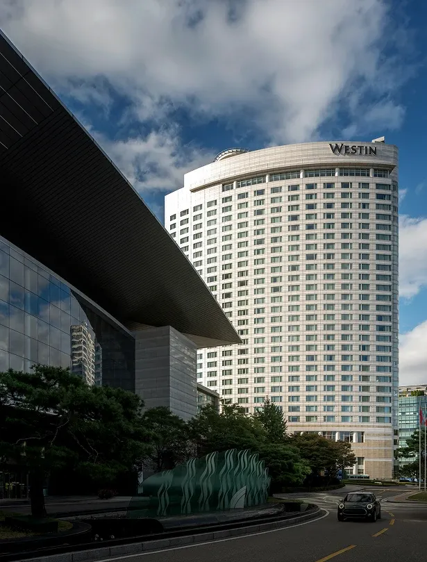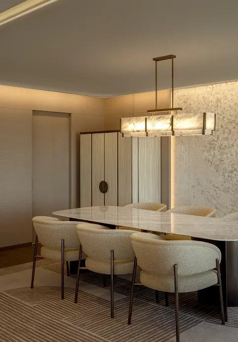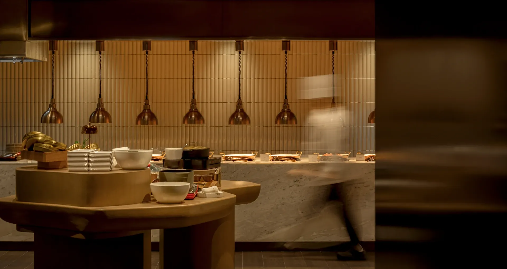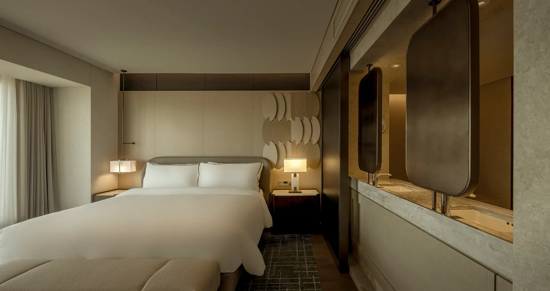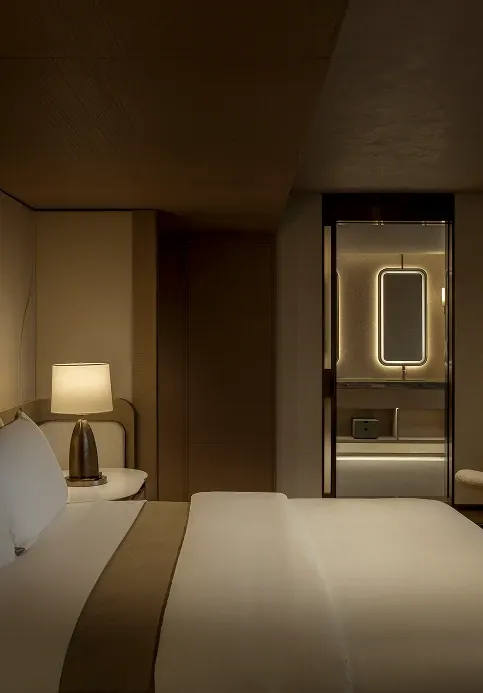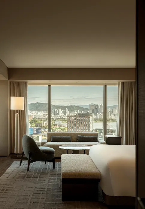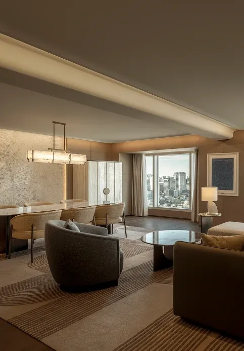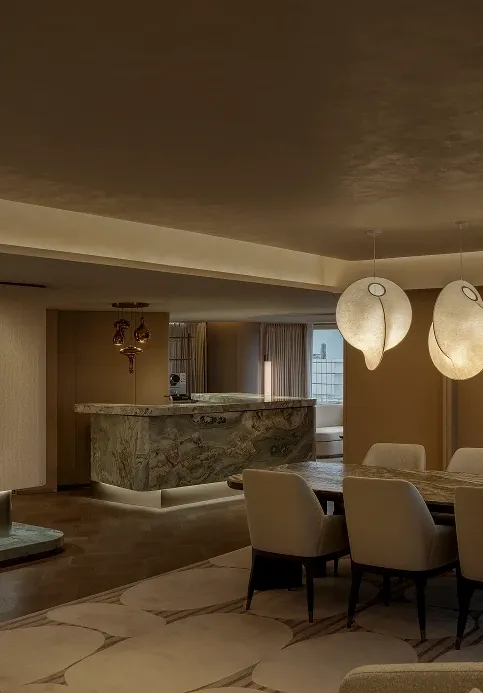 Stepping into the all-day dining restaurant feels like entering a breathing urban oasis, where warm timber and raw stone intersect to capture nature's purest textures. Cultural nuances emerge through modern geometric deconstructions of traditional Korean Bojagi fabrics, elegantly rendered in stone and wired glass. As sunlight filters through the layered latticework, every dining moment is bathed in a warm, healing glow.