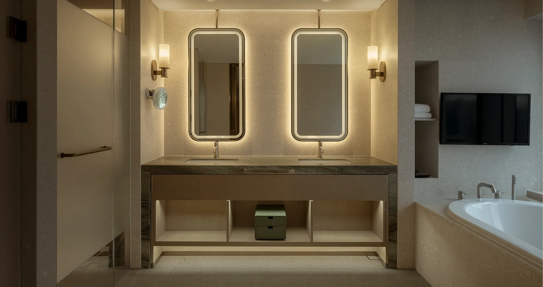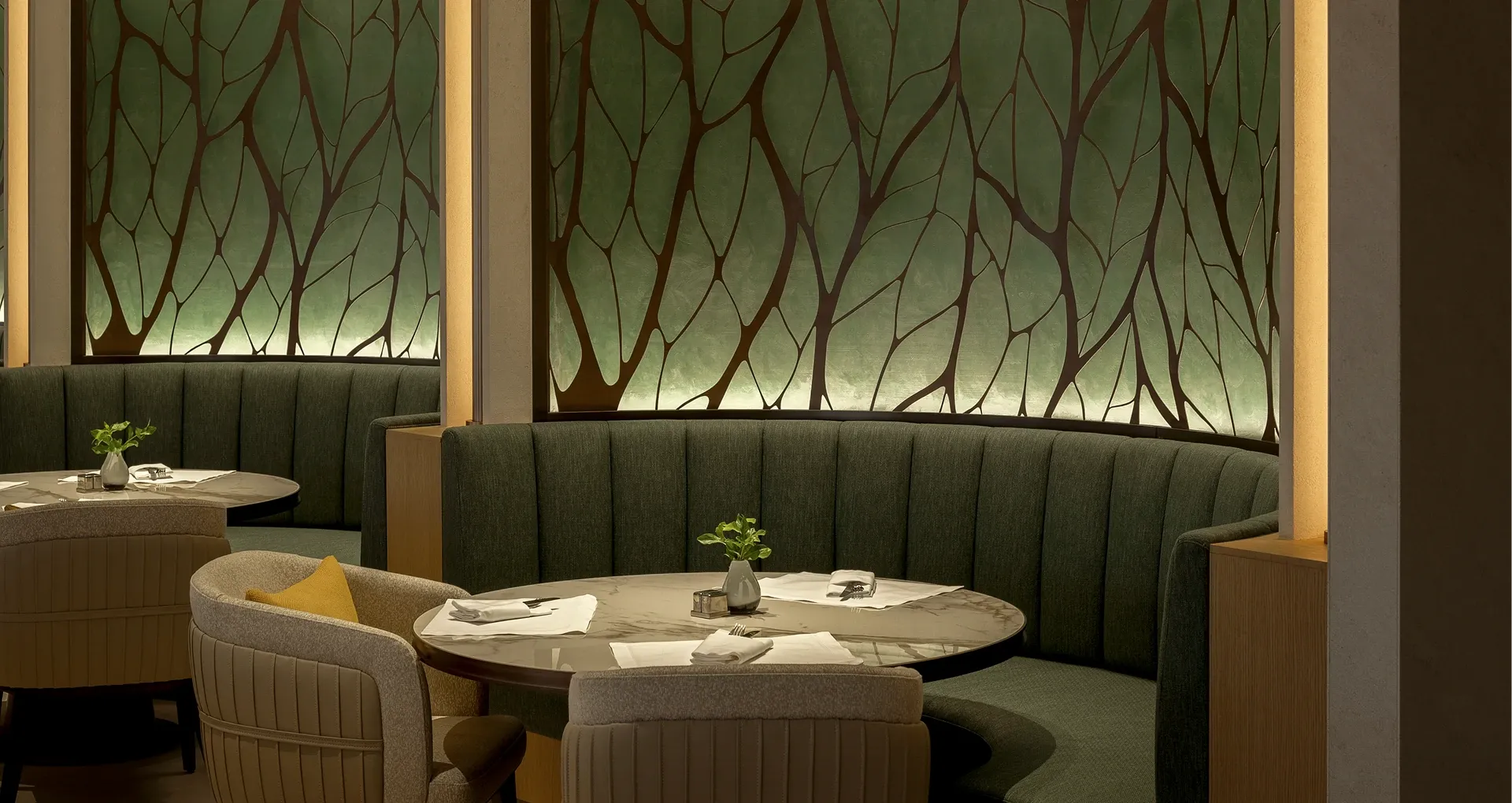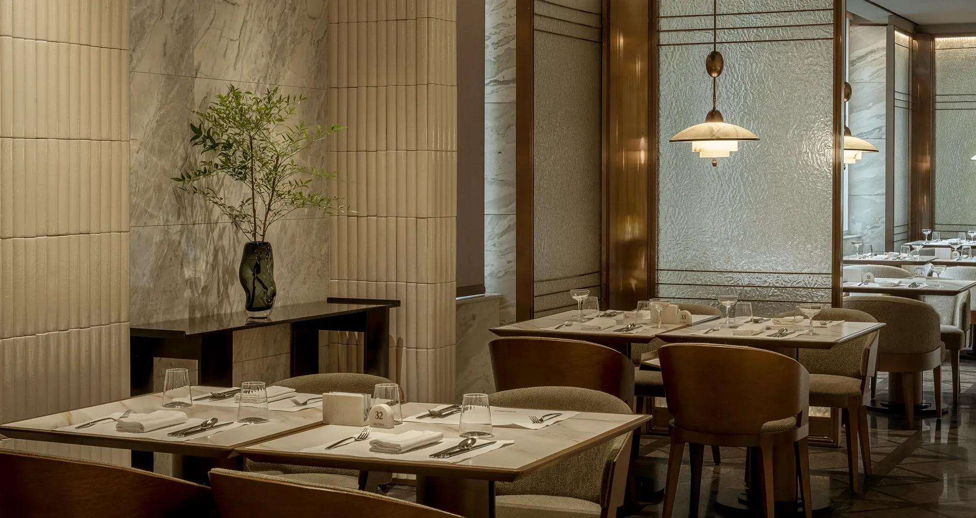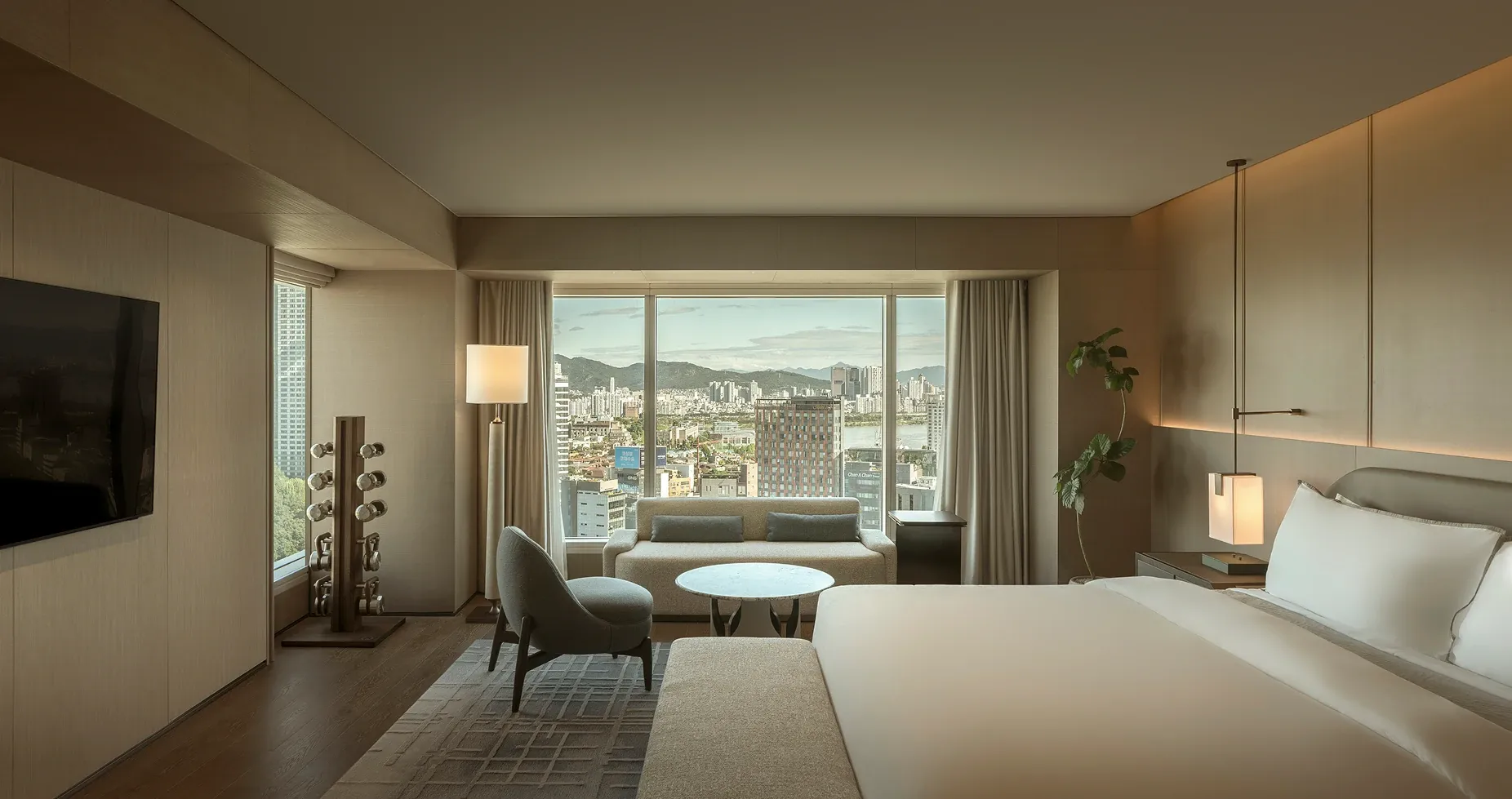 Stepping into the all-day dining restaurant feels like entering a breathing urban oasis, where warm timber and raw stone intersect to capture nature's purest textures. Cultural nuances emerge through modern geometric deconstructions of traditional Korean Bojagi fabrics, elegantly rendered in stone and wired glass. As sunlight filters through the layered latticework, every dining moment is bathed in a warm, healing glow.