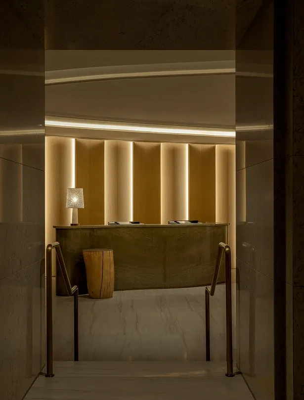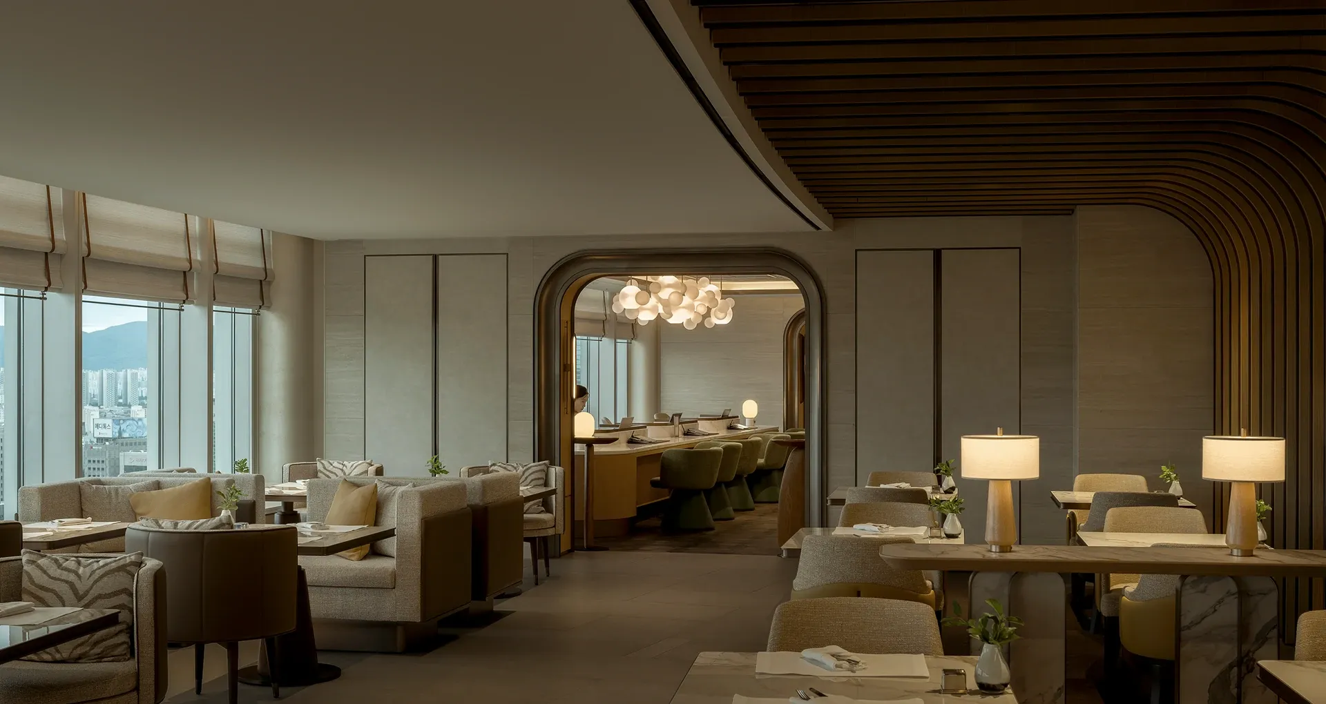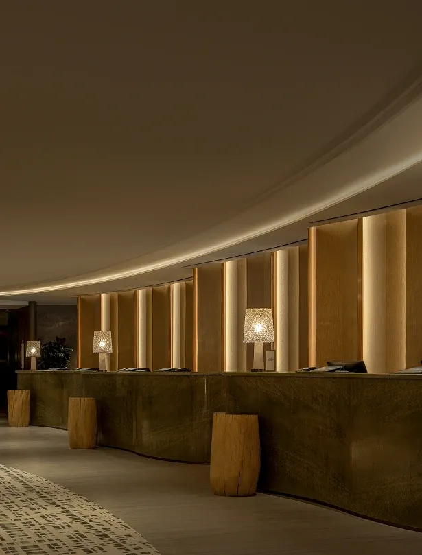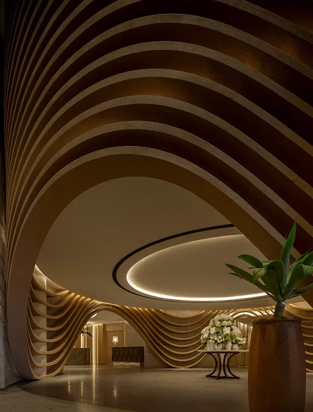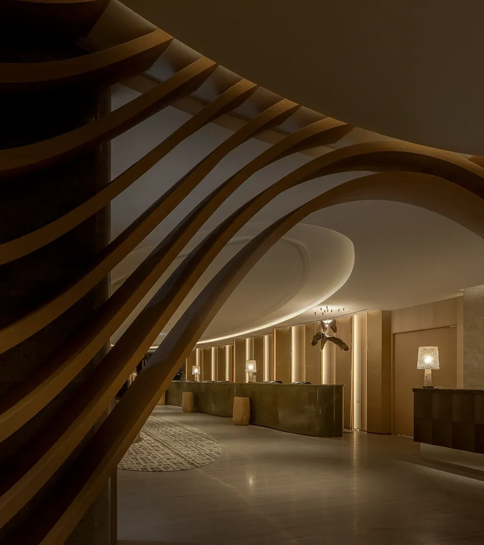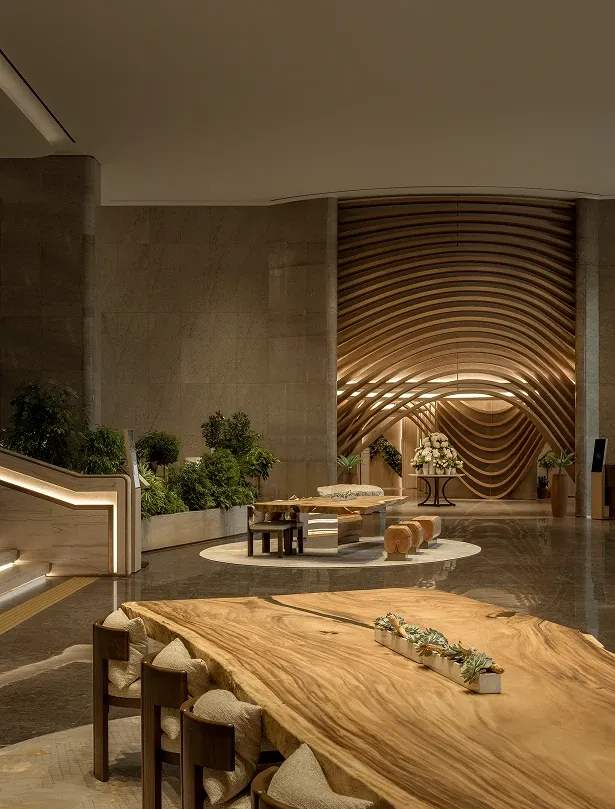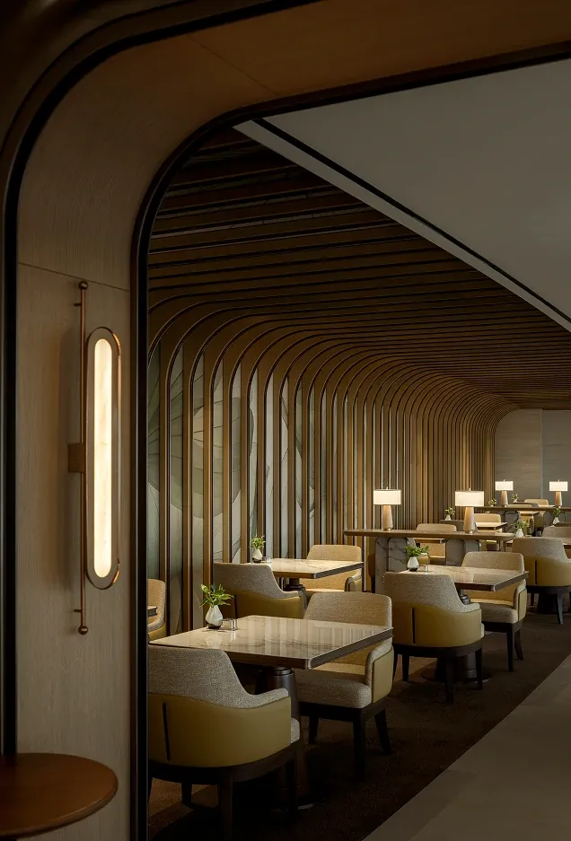 The executive lounge continues this narrative of natural elegance. A sweeping, curved wooden ceiling utilizes fluid lines to guide the eye outward, while the harmony of warm wood paneling and sleek marble countertops celebrates organic beauty, anchoring the space in a deep sense of refined sophistication.