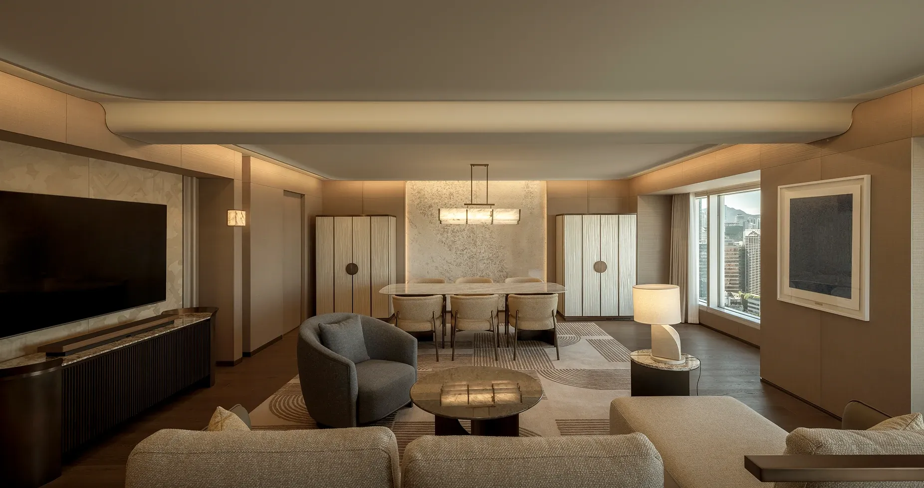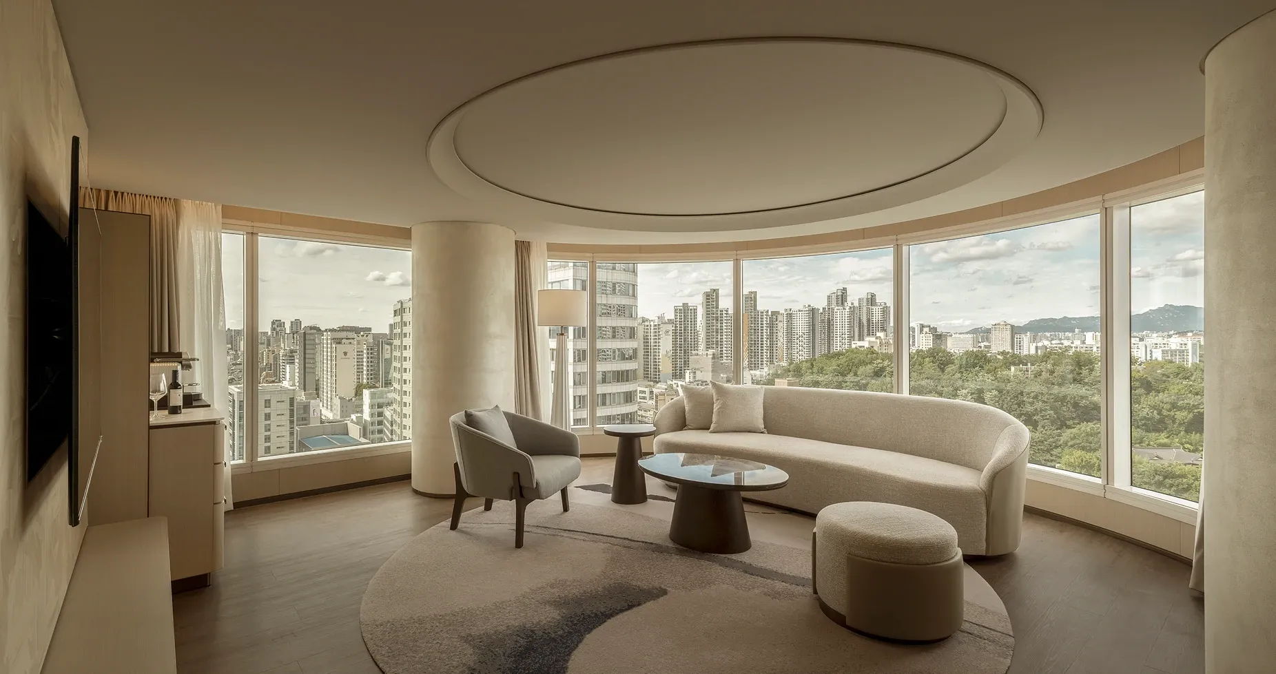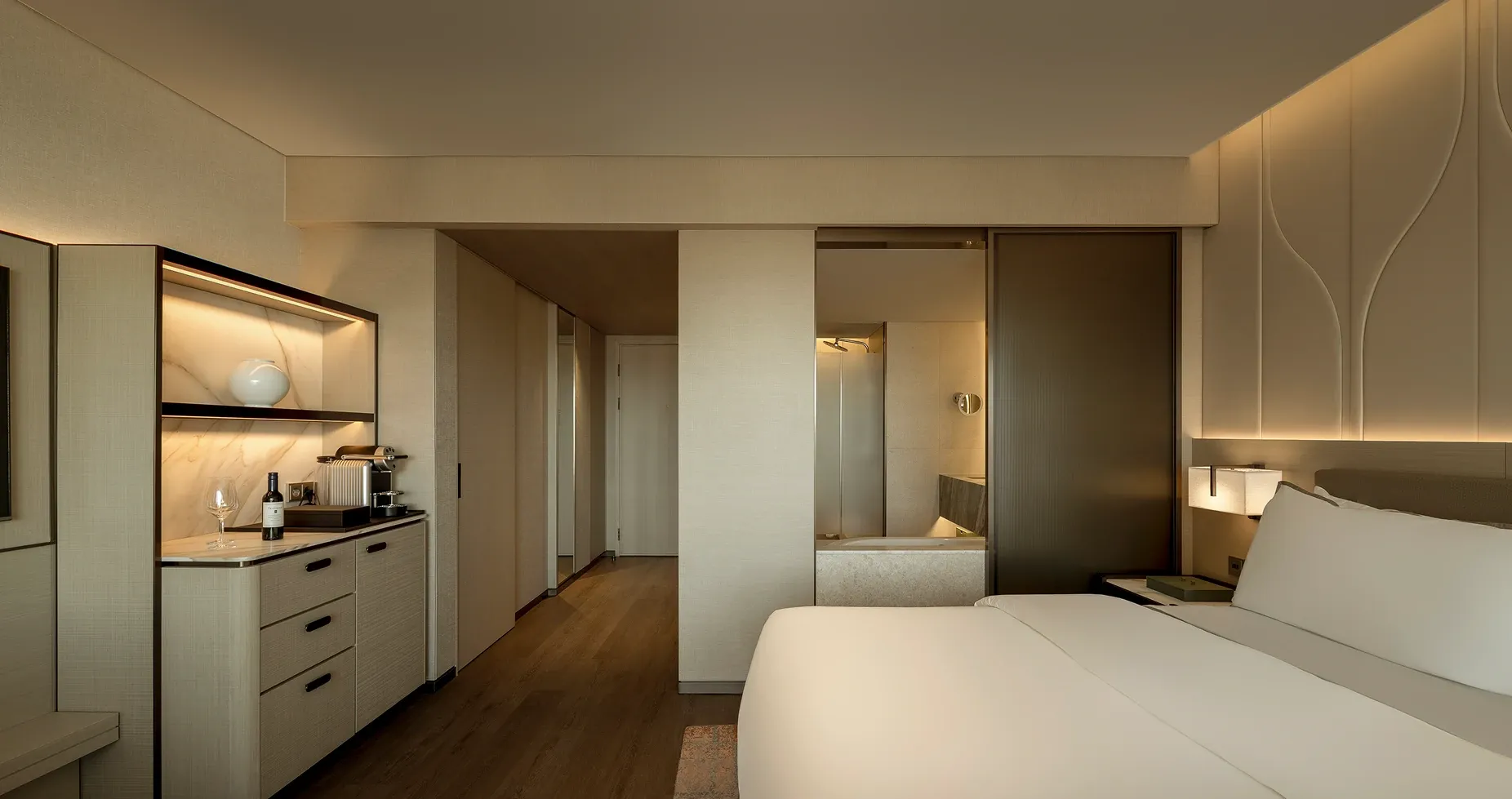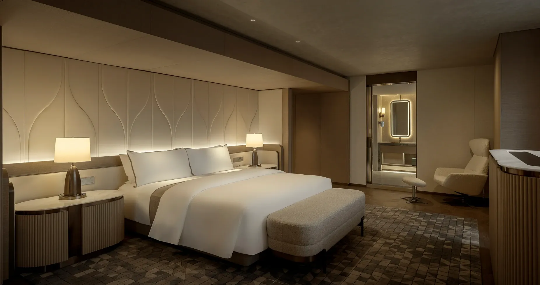 The executive lounge continues this narrative of natural elegance. A sweeping, curved wooden ceiling utilizes fluid lines to guide the eye outward, while the harmony of warm wood paneling and sleek marble countertops celebrates organic beauty, anchoring the space in a deep sense of refined sophistication.